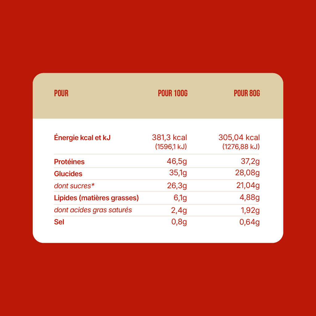 | dont Sucres* | 35,8 g | 28,64 g | ||||||||||||||||||||||||||||||||||||||||||||||||||||||||||||||||||||||||||||||||||||||||||||||||||||||||||||||||||||||||||||||||||||||||||||||||
