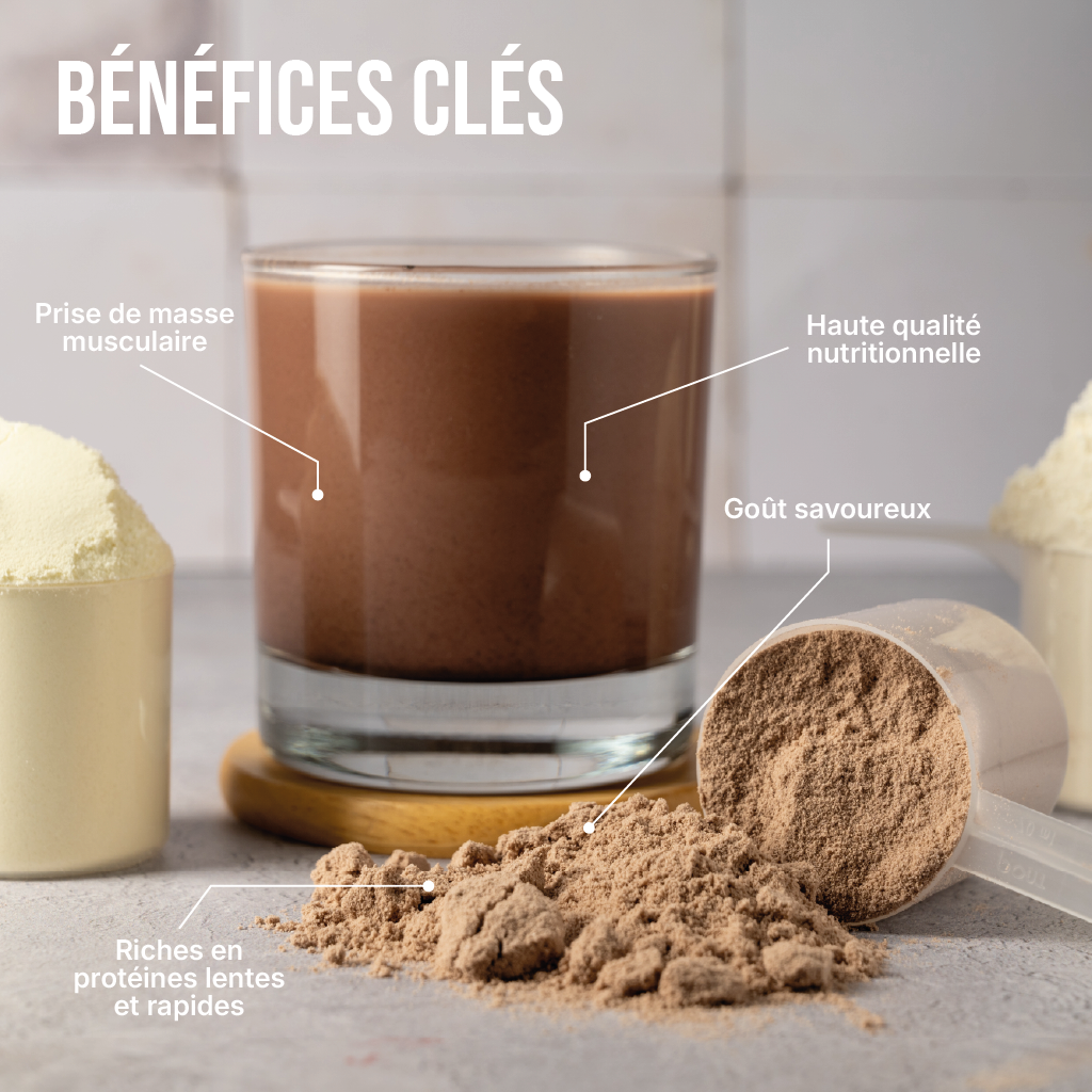 Idéalement après l’entraînement, pour optimiser la récupération et la synthèse musculaire. Vous pouvez aussi l’utiliser en collation entre vos 3 repas quotidiens si vous avez du mal à atteindre votre quota calorique.