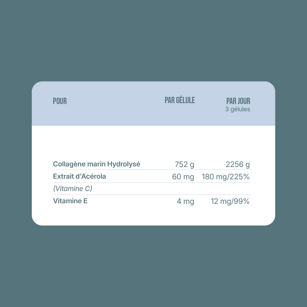 Le collagène en gélules de YAM Nutrition est composé uniquement de collagène marin hydrolysé de type I. Une source de vitamine C naturelle issue de l'acérola apporte 60 mg de vitamine C par gélule. De la vitamine E est également ajoutée pour son aspect antioxydant. Une gélule libère 752 mg de collagène marin hydrolysé de première qualité nutritionnelle.