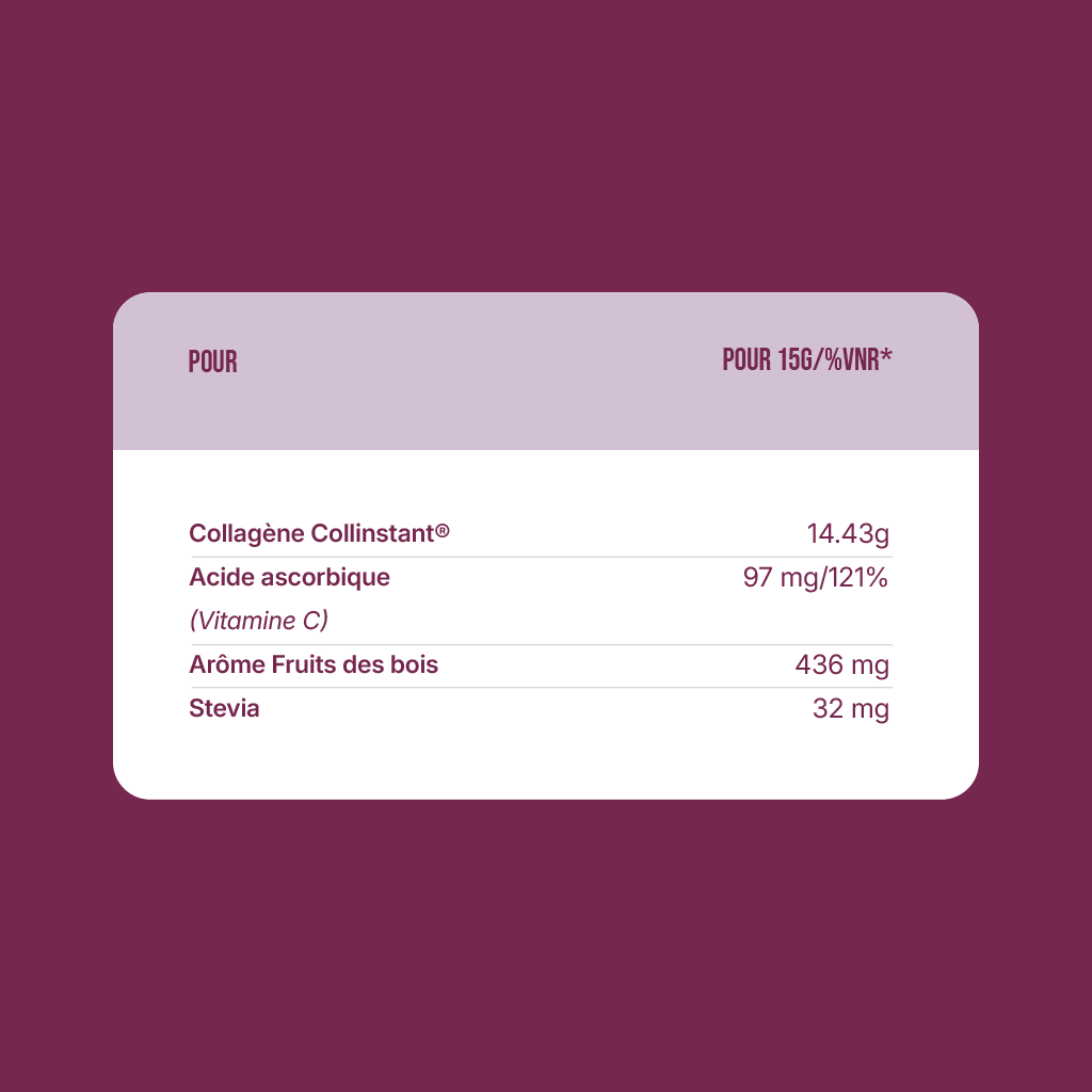 Hydrolysat de collagène Collinstant®, acide ascorbique (vitamine C), arôme fruits des bois, stevia.