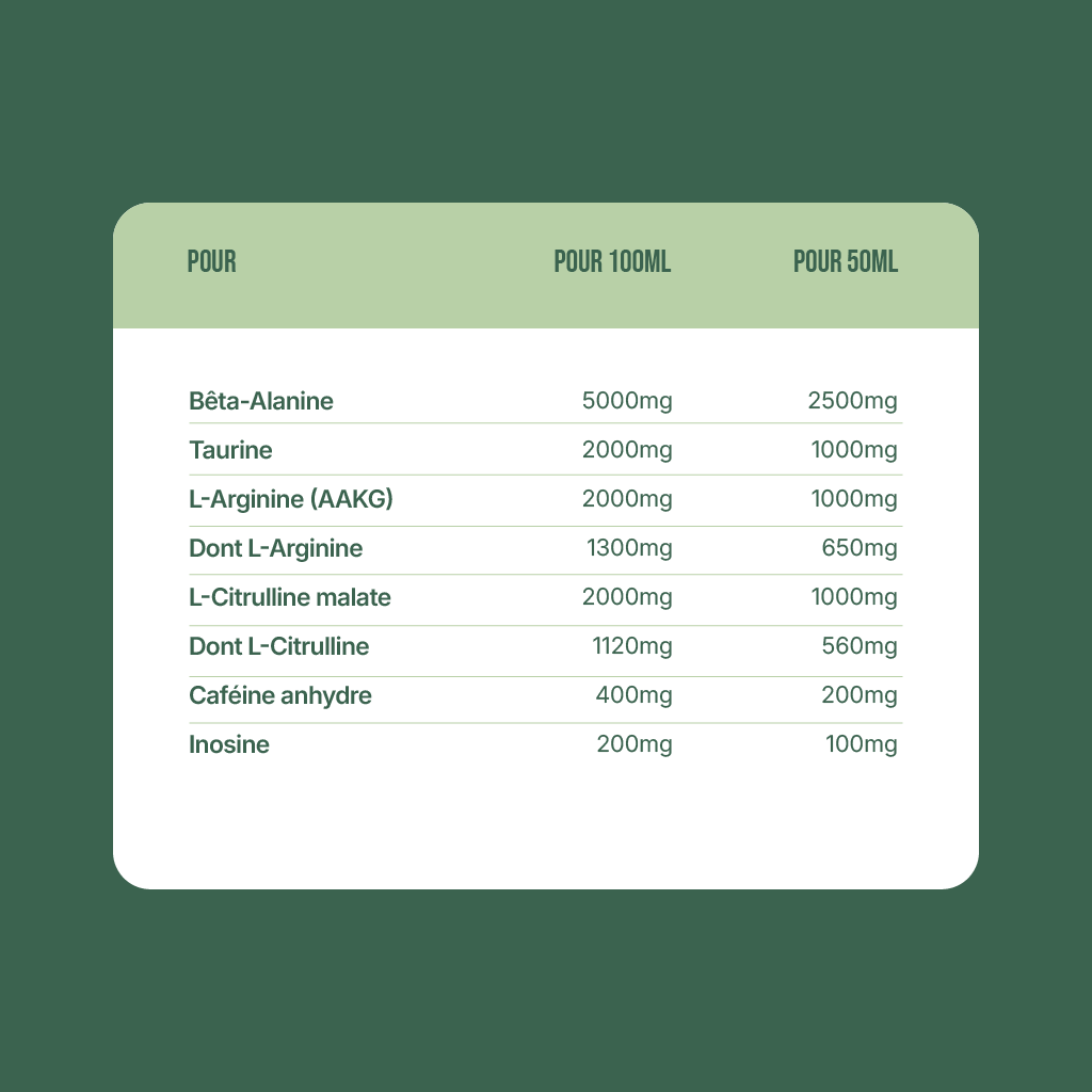 | Bêta-Alanine | 5 000 mg | 2 500 mg |