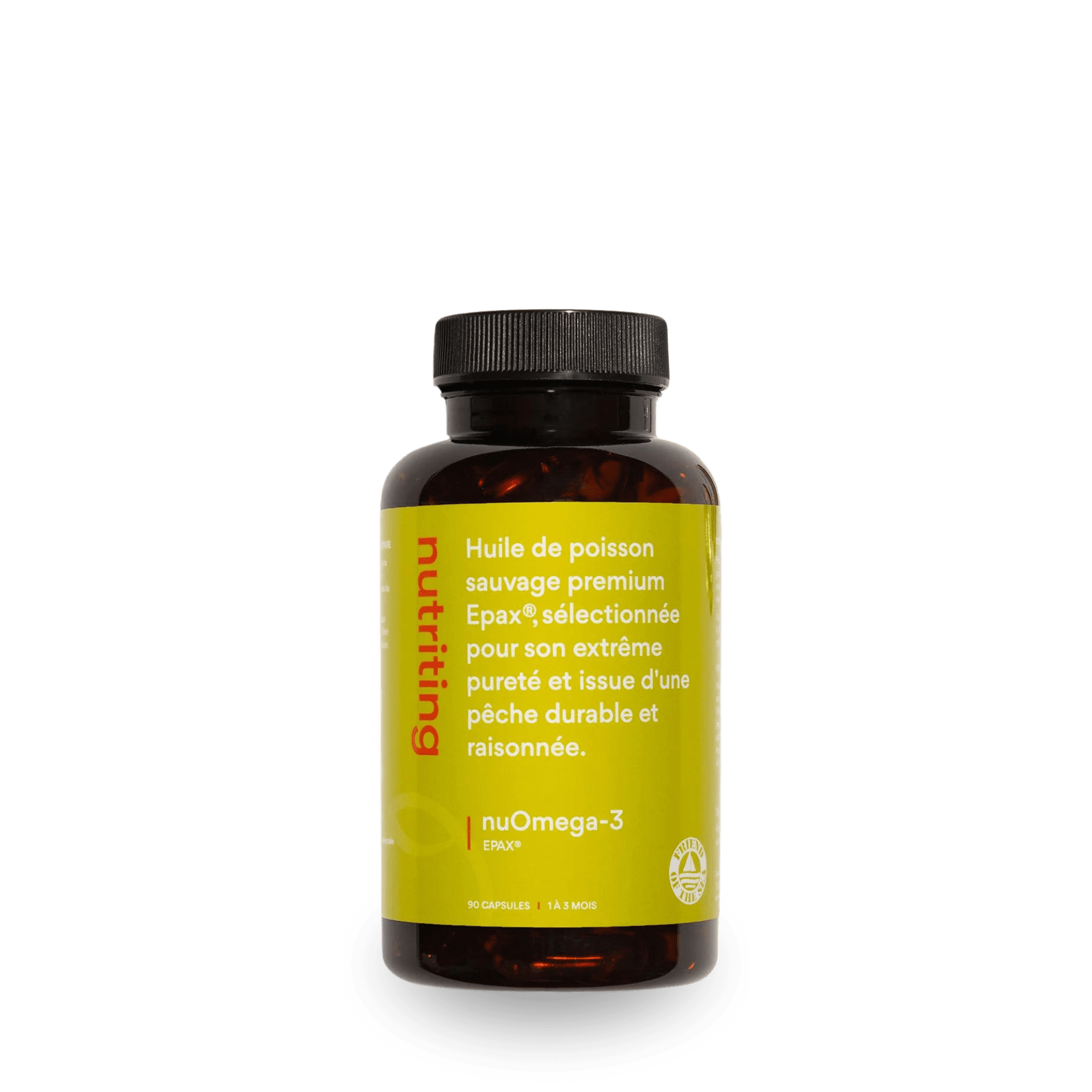 Huile de poisson (origine : Norvège) concentrée en oméga-3 (40% EPA, 30% DHA), enveloppe : gélatine (marine), humectant : glycérine, antioxydants : mélange de tocophérols naturels et extrait de romarin.